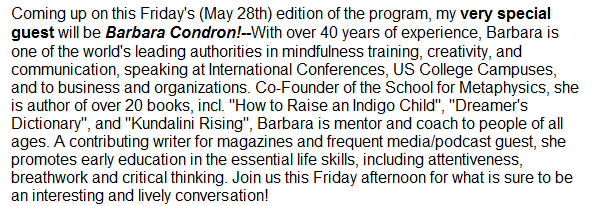 My guest this Friday for the radio show will be Barbara Condron! May 26, 2021 by namaha108, posted in Uncategorized Share this: Click to share on X (Opens in new window) X Click to share on Facebook (Opens in new window) Facebook Click to email a link to a friend (Opens in new window) Email Like Loading... Related